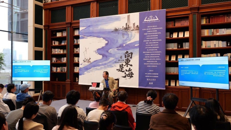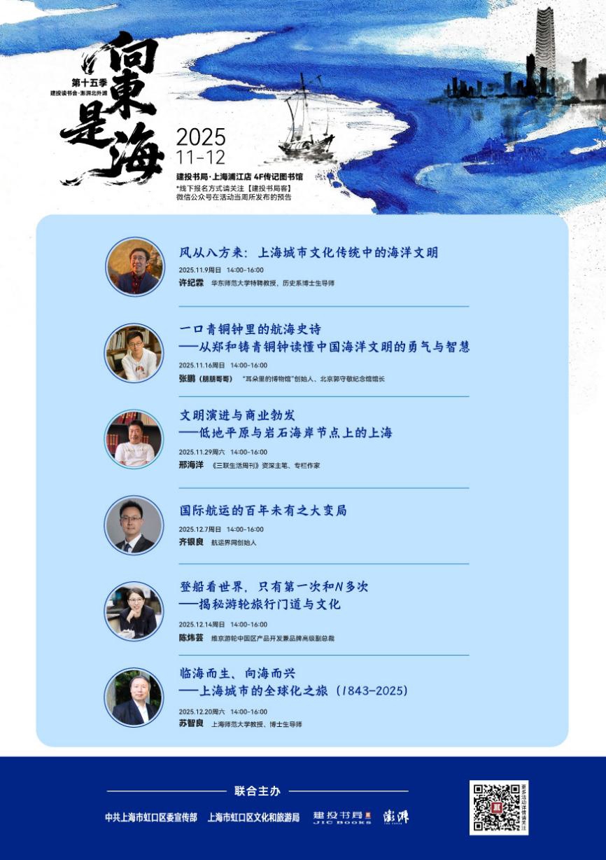作为北外滩的一张人文名片,“建投读书会·澎湃北外滩”自2017年启动至今,已举办十四季共84期活动,推出“上海”“大师”“江南”“读城”等主题系列,并汇编出版了《上海纪》《江南纪》(《读城纪》即将出版)。本季读书会围绕“文明互鉴、器纳百川、海陆形胜、邮轮文旅、航贸新章、寰球征程”等板块,邀请多位学者从历史文化、产业经济、文旅结合等角度,解读上海如何以海为媒,在历史与未来的交汇处续写开放、进取的蓝色篇章。讲座内容紧密结合虹口北外滩的航运金融、邮轮旅游等区域产业特色,推动文化与产业、旅游的深度融合,将持续至12月底。