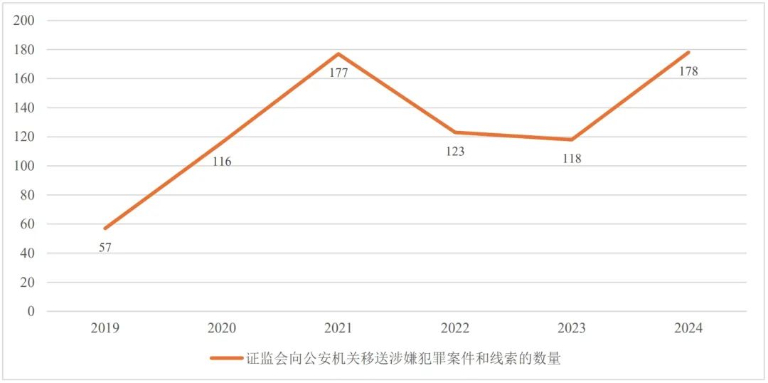 根据证监会公布的数据(见下图),近年来,证监会每年持续不断地向公安机关移送涉嫌犯罪案件和线索,2022年至2024年共移送419件;根据2025年2月21日证监会与最高检联合举行新闻发布会公布的数据,2022年至2024年,全国检察机关共起诉证券犯罪366件1,011人,起诉案件数、人数年均增长30.5%、16%。