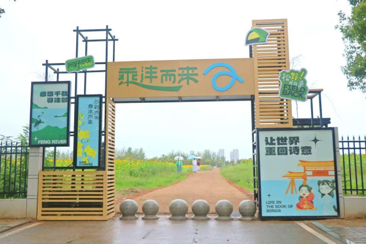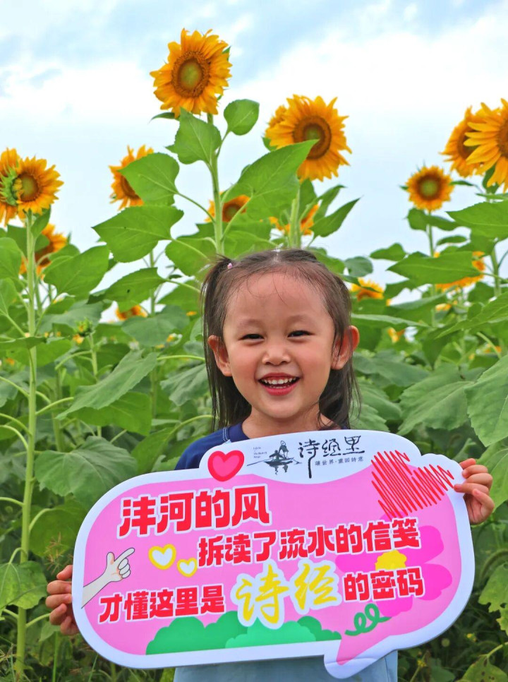 站在花田边望去,金黄的花瓣与远处的诗经里古风建筑相映成趣,微风拂过,花浪翻滚间还能听见沣河的流水声,仿佛是从诗词里走出来的风景。