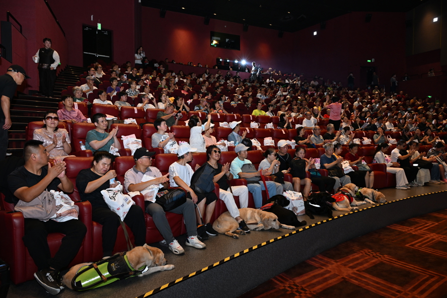 在志愿者引导下,导盲犬的主人在影厅第一排坐下,犬只安静趴在脚边。整个影厅360多个座位几乎满座。与日常观影不同,这里的观众几乎都是视障者,影厅一角还配备了专门的现场解说团队。当灯光暗下,银幕亮起,除了影片本身的台词和配乐,现场还响起了一道温暖的人声,描述着人物的表情、场景的变换、动作的细节……